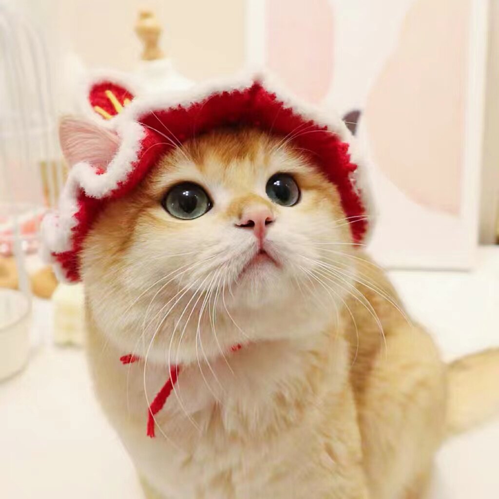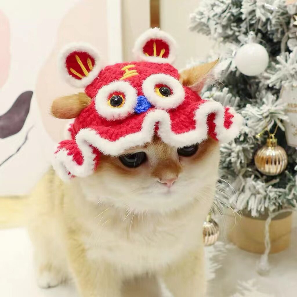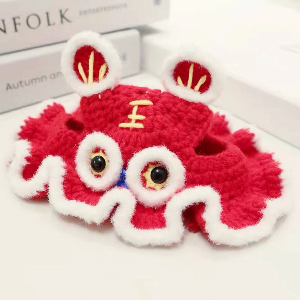 お正月や新春のお祝いにぴったりな獅子舞デザインの猫服帽子です。 ふわふわのもこもこ素材で作られた獅子舞の顔に、大きな目玉と立体的な耳飾りが特徴的です。 頭頂部には縁起の良い文字の装飾が施され、華やかな雰囲気を演出します。 猫ちゃんの耳を通す穴が設けられており、快適に着用できる設計になっています。 記念撮影やお祝いの席で、愛猫を主役にしてくれる縁起物の帽子です。