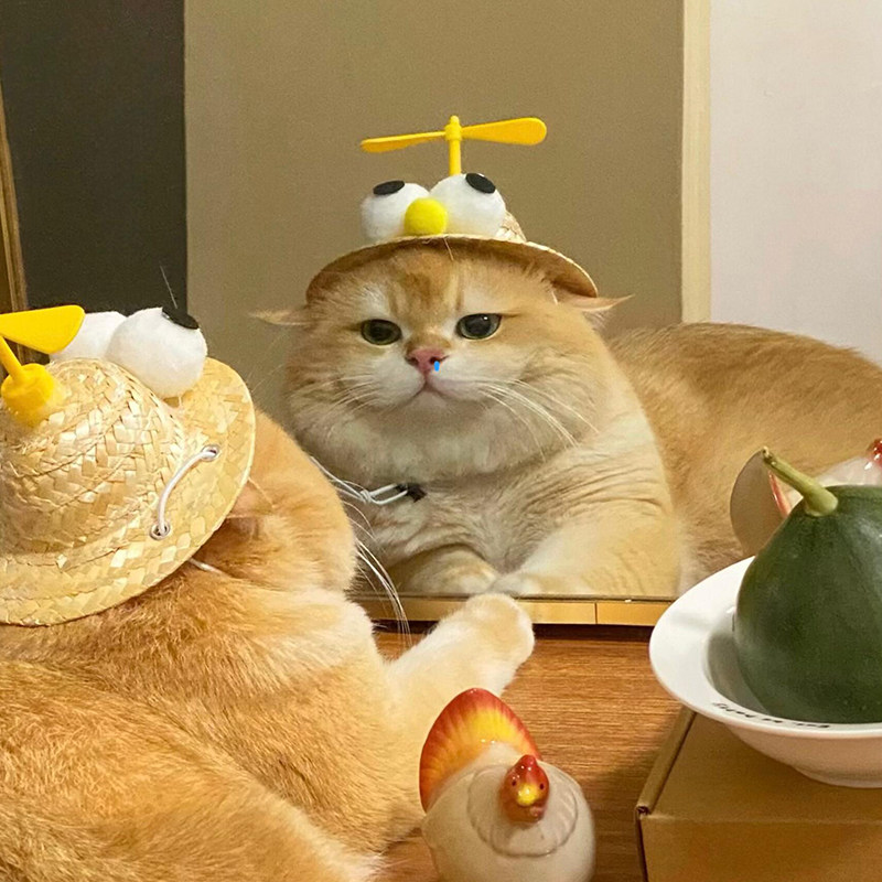 ユニークな竹とんぼのプロペラが頭上でくるくる回る、遊び心満載の猫服用帽子です。 麦わら風のナチュラルな素材で作られたつば広デザインに、大きな目玉飾りと黄色いくちばしが付いて、愛猫をユーモラスに演出します。 顎紐付きで脱げにくく、写真撮影や記念日のおめでかしに最適です。 愛猫の可愛らしさを引き立てる、個性的なアクセサリーとしておすすめの一品です。
