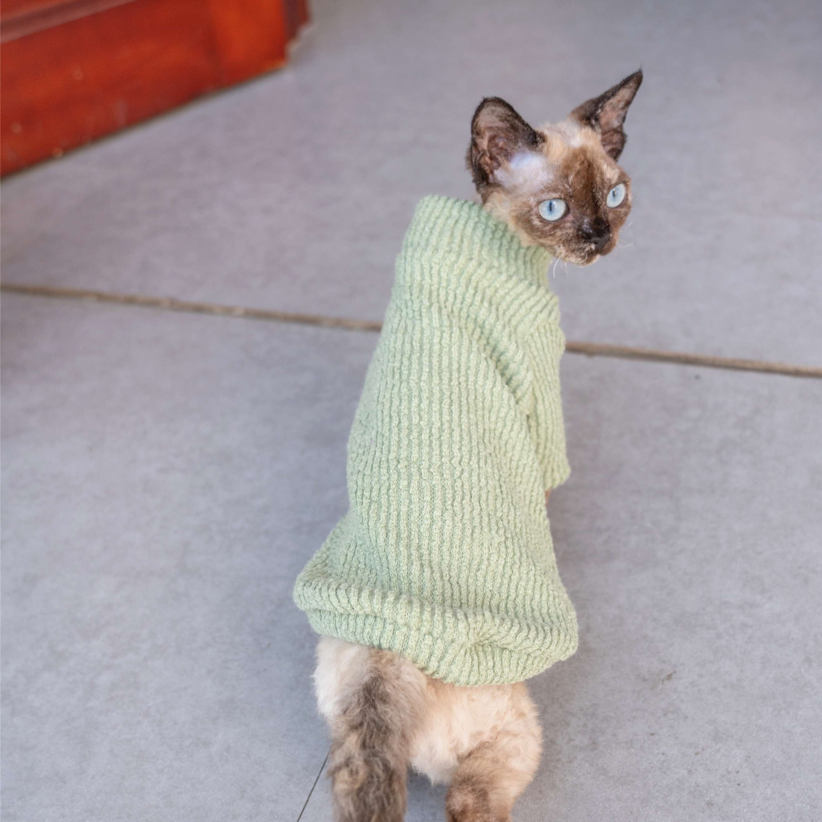 シャム猫や短毛種に最適な暖かニットセーター。柔らかな薄緑色の生地が体を優しく包み込み、タートルネックデザインで首元をしっかりカバー。寒い季節でも快適に過ごせる防寒服として、お洒落さと実用性を兼ね備えた一着。愛猫を寒さから守りながら、スタイリッシュに演出します。