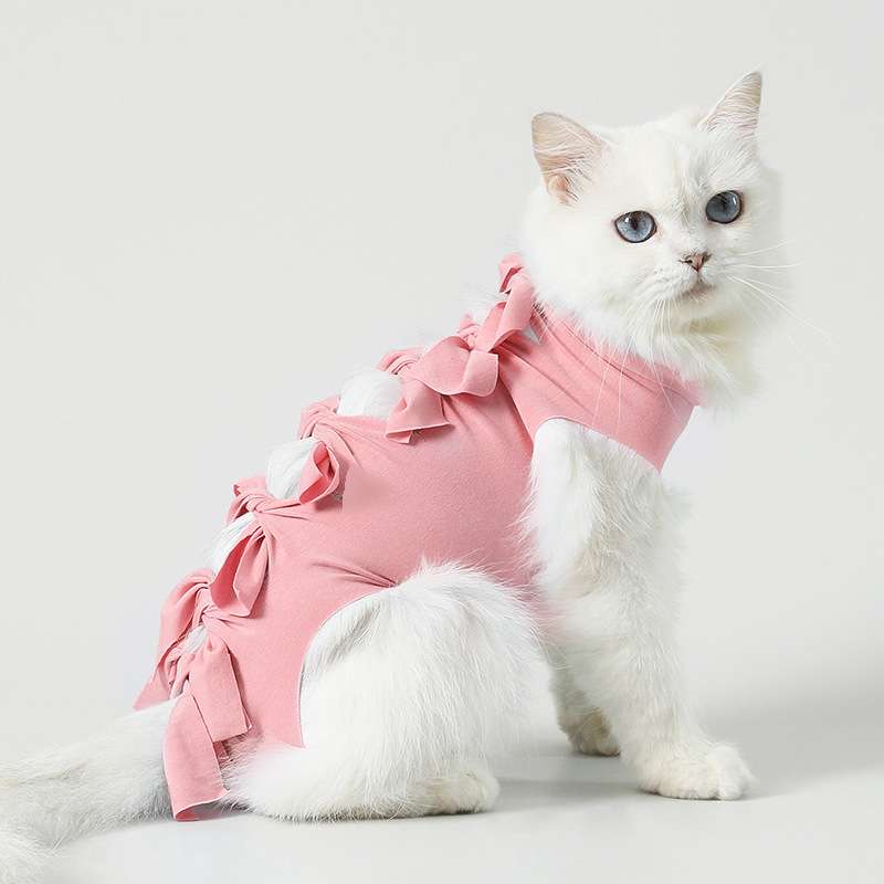 愛猫の術後ケアにぴったりなワンピース型の術後服。柔らかな生地が肌に優しく、背中から腹部にかけての可愛いリボンが魅力的。傷舐め防止と保温効果を兼ね備え、着脱も容易でストレスフリー。愛猫の動きを妨げることなく、快適な回復をしっかりサポートします。おしゃれで機能的なデザインで、術後の心強い味方です。