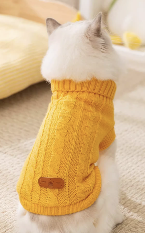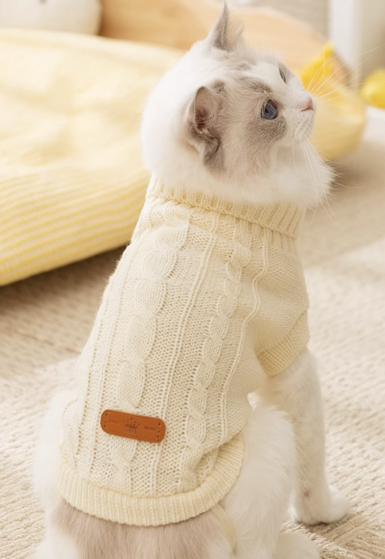 ケーブル編みのデザインが施された厚手のニット素材で、保温性が高く、猫ちゃんを寒さから守りながらも愛らしい印象を与えます。