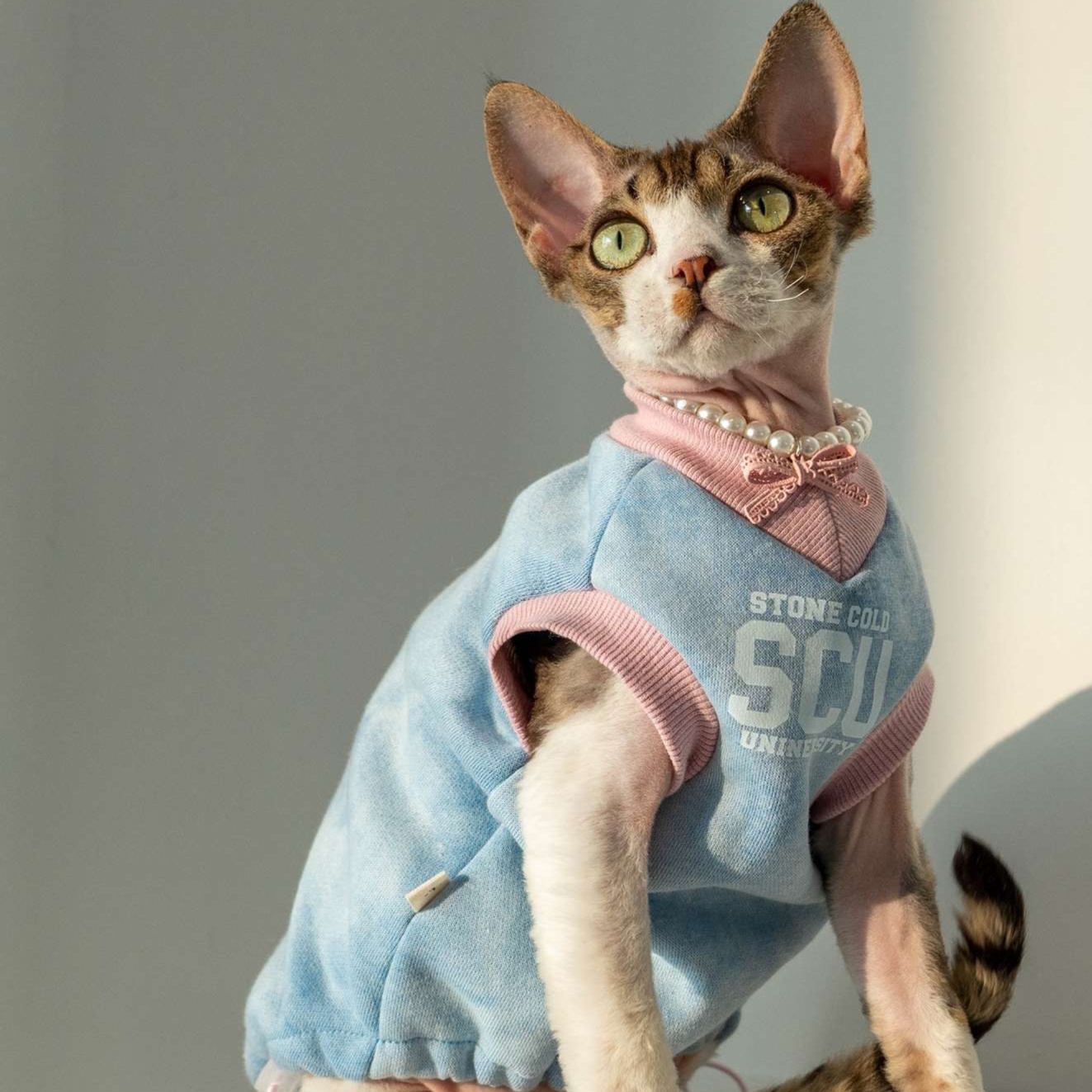 大学風デザインの猫用パーカー、寒い季節にぴったりの防寒服。暖かい素材で、猫ちゃんも快適に過ごせる。首元の真珠風アクセサリーが可愛らしさを演出し、背中のロゴはスポーティな印象をプラス。おしゃれでありながら普段使いにも最適な一着。どんなシーンでも愛猫をスタイリッシュに保温します。
